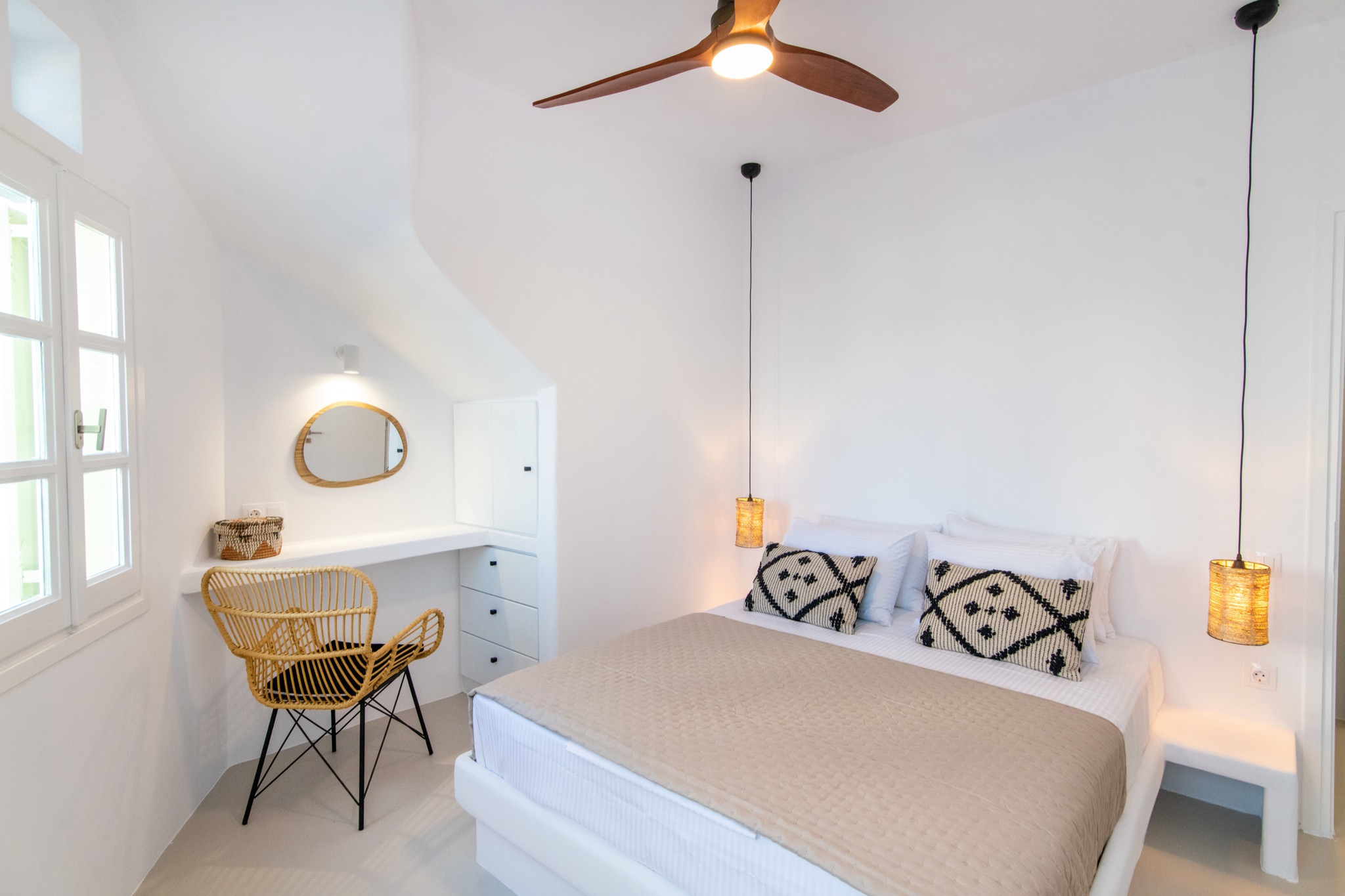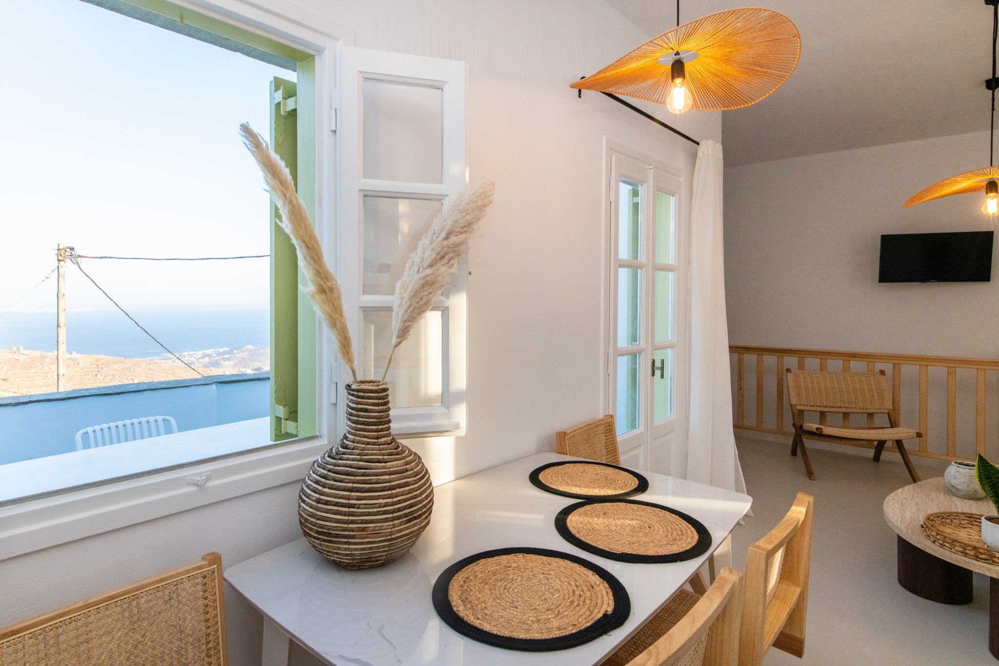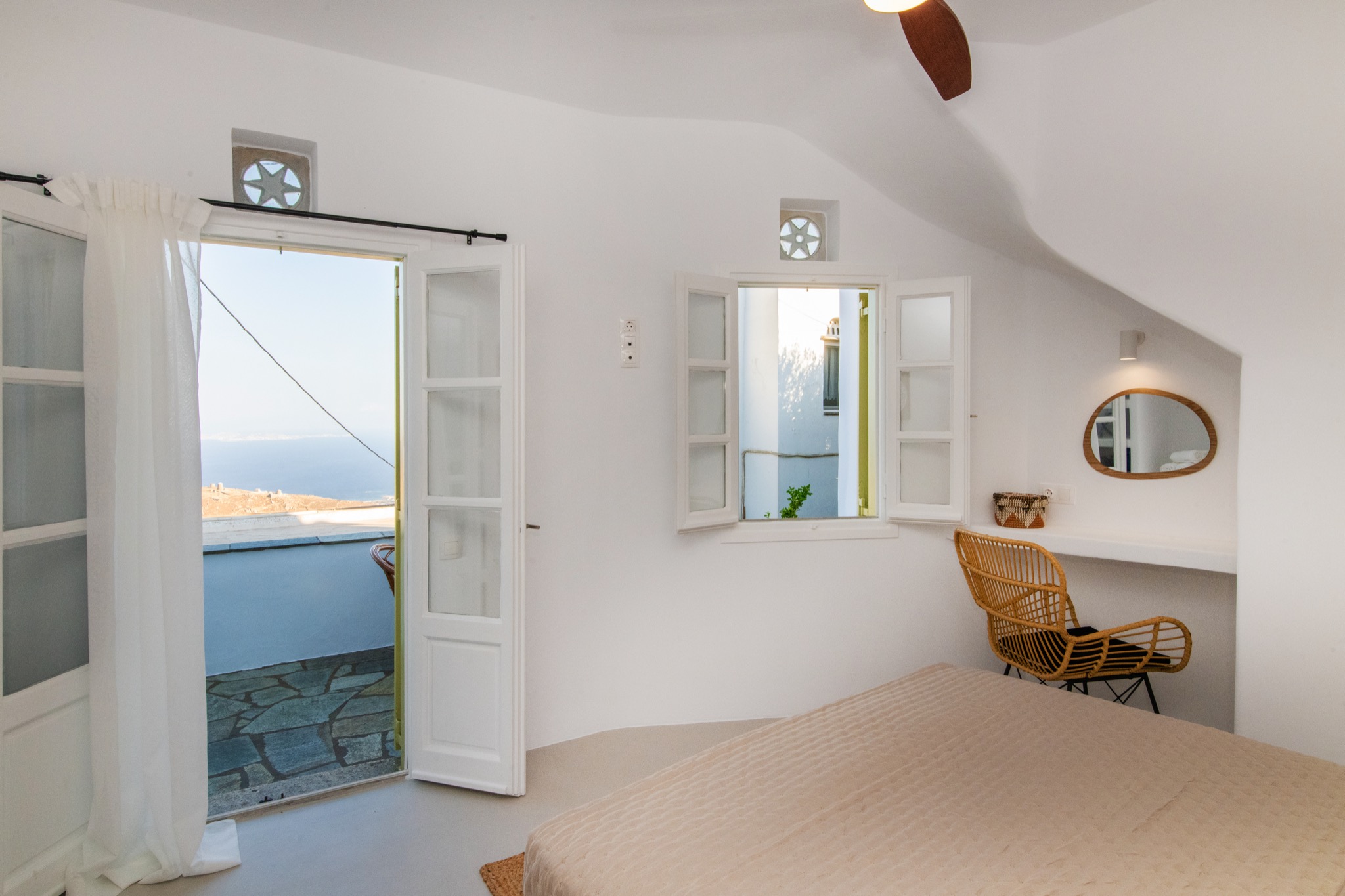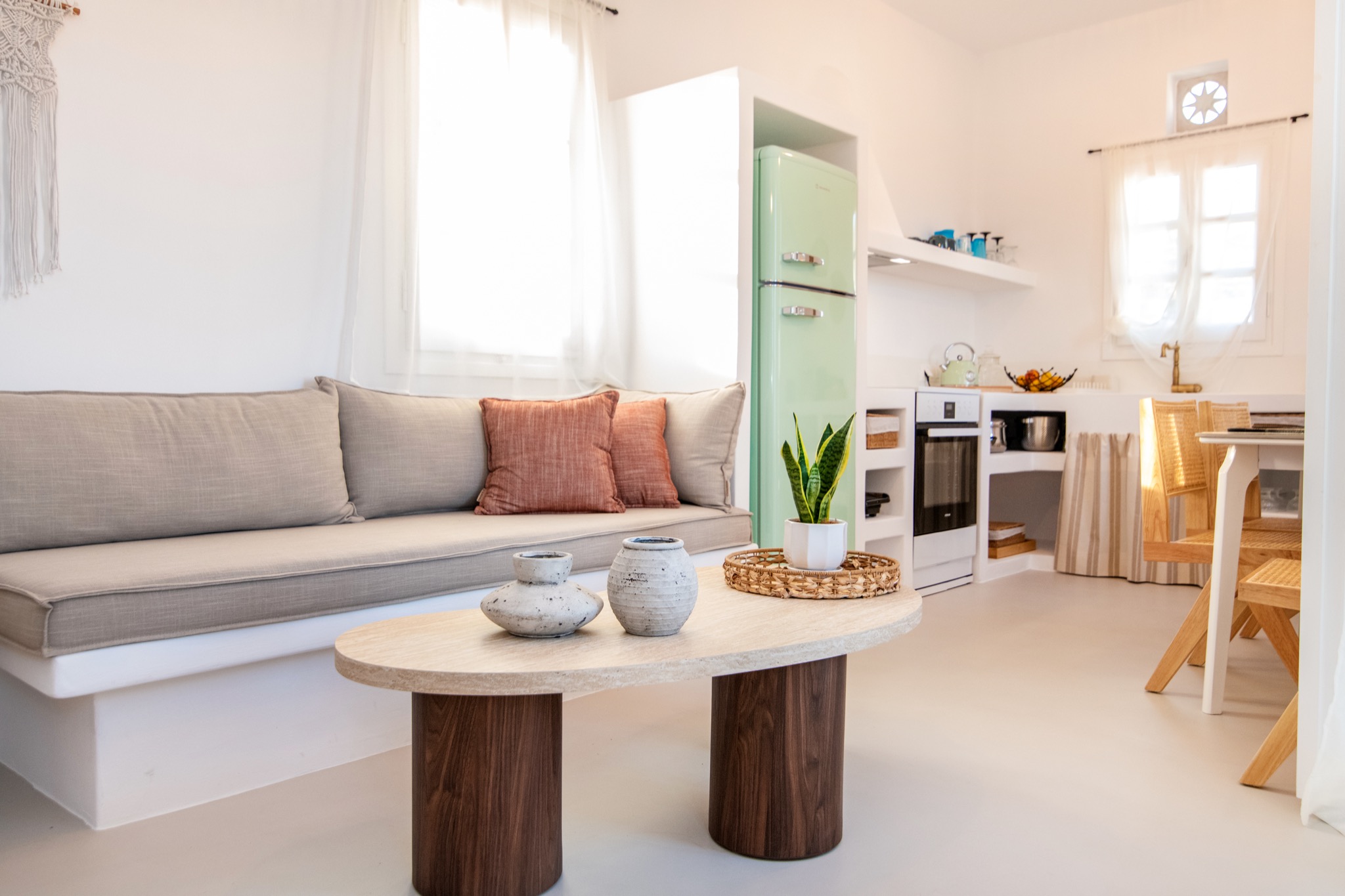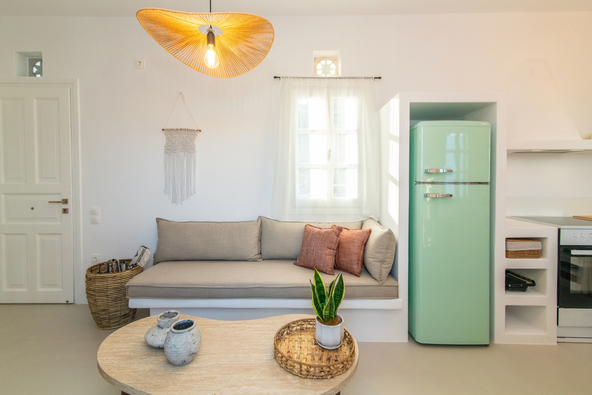 The interior features Cycladic minimalism, natural textures, and earthy tones, offering a cozy and elegant retreat.