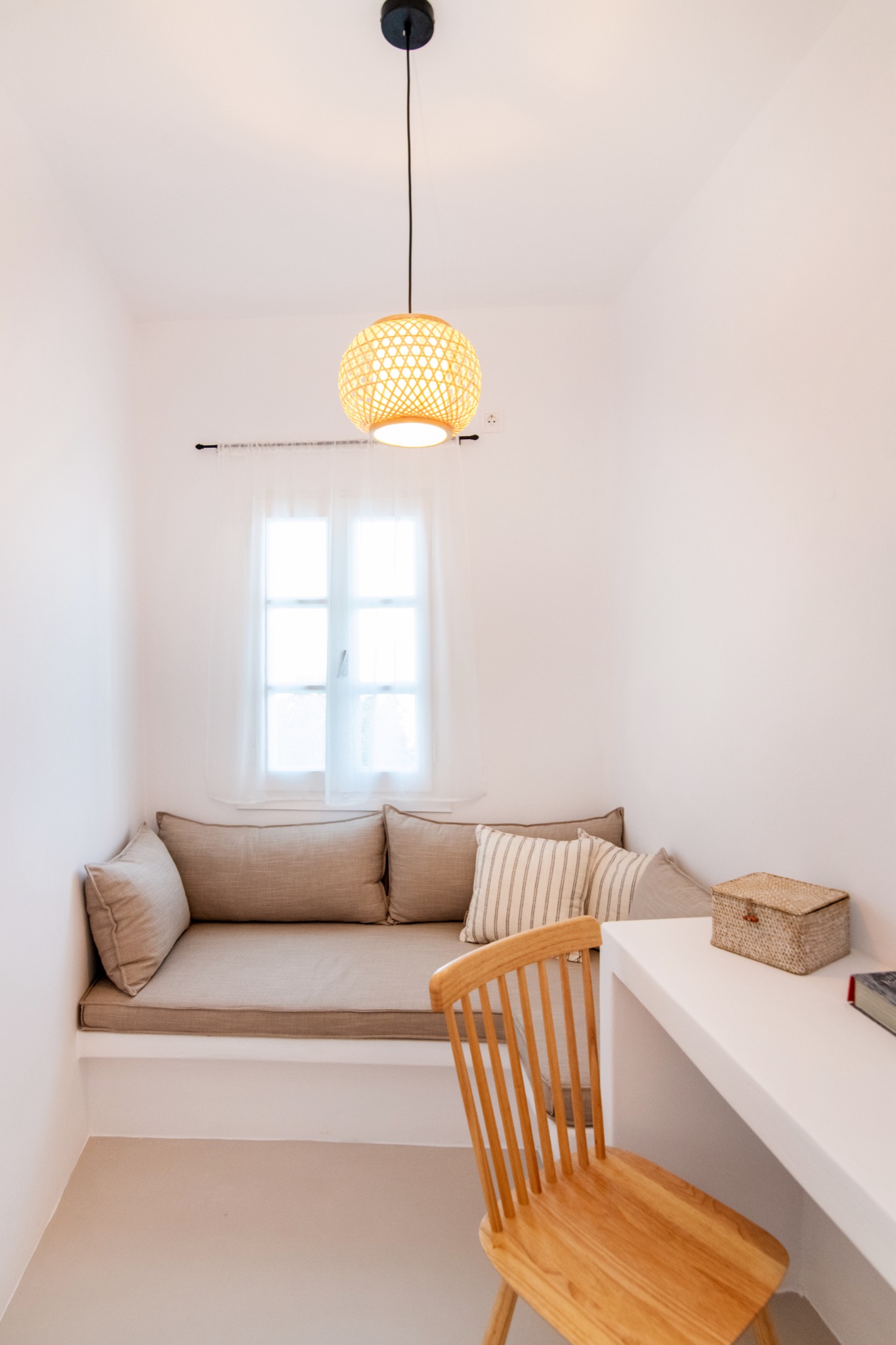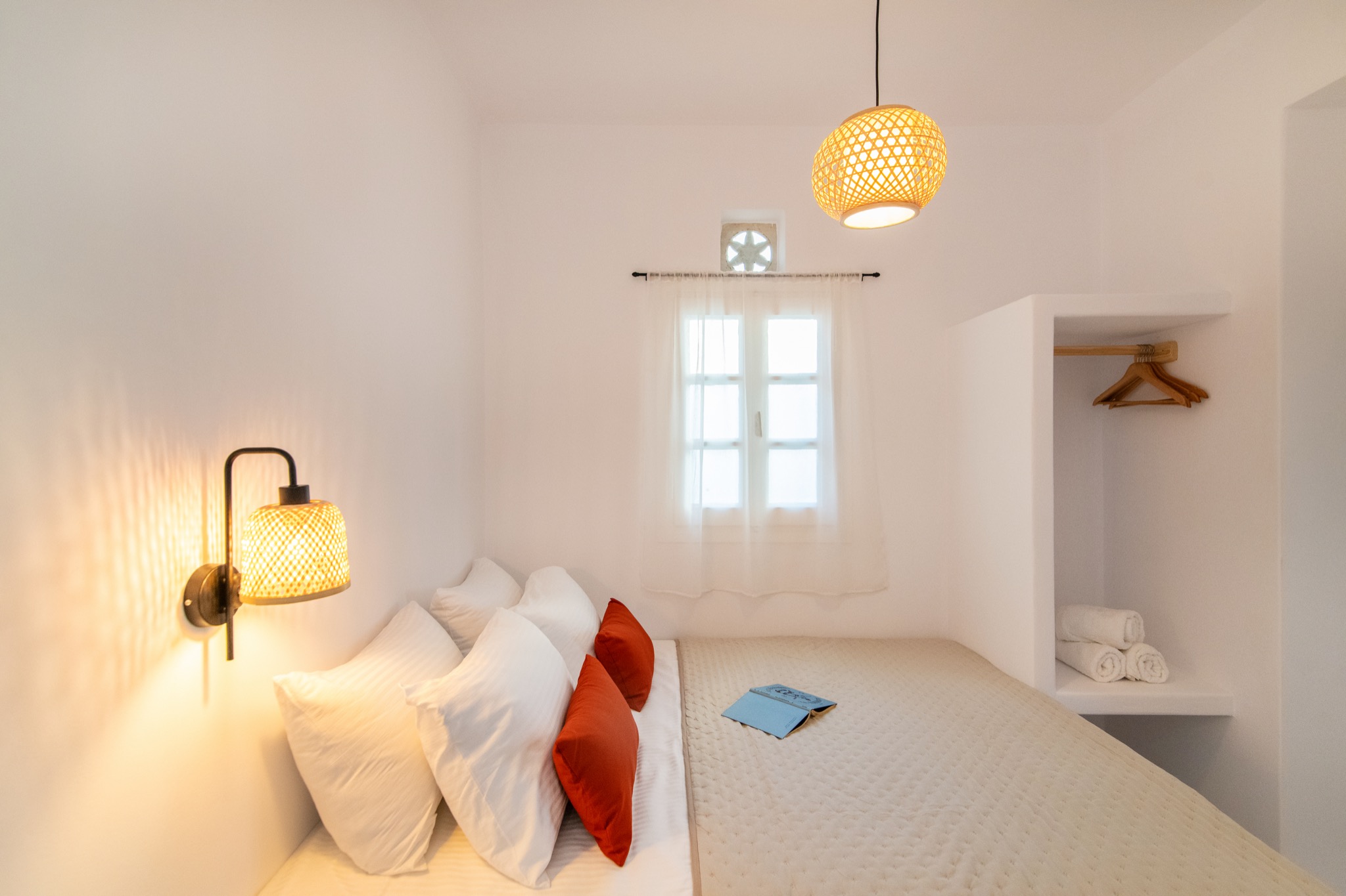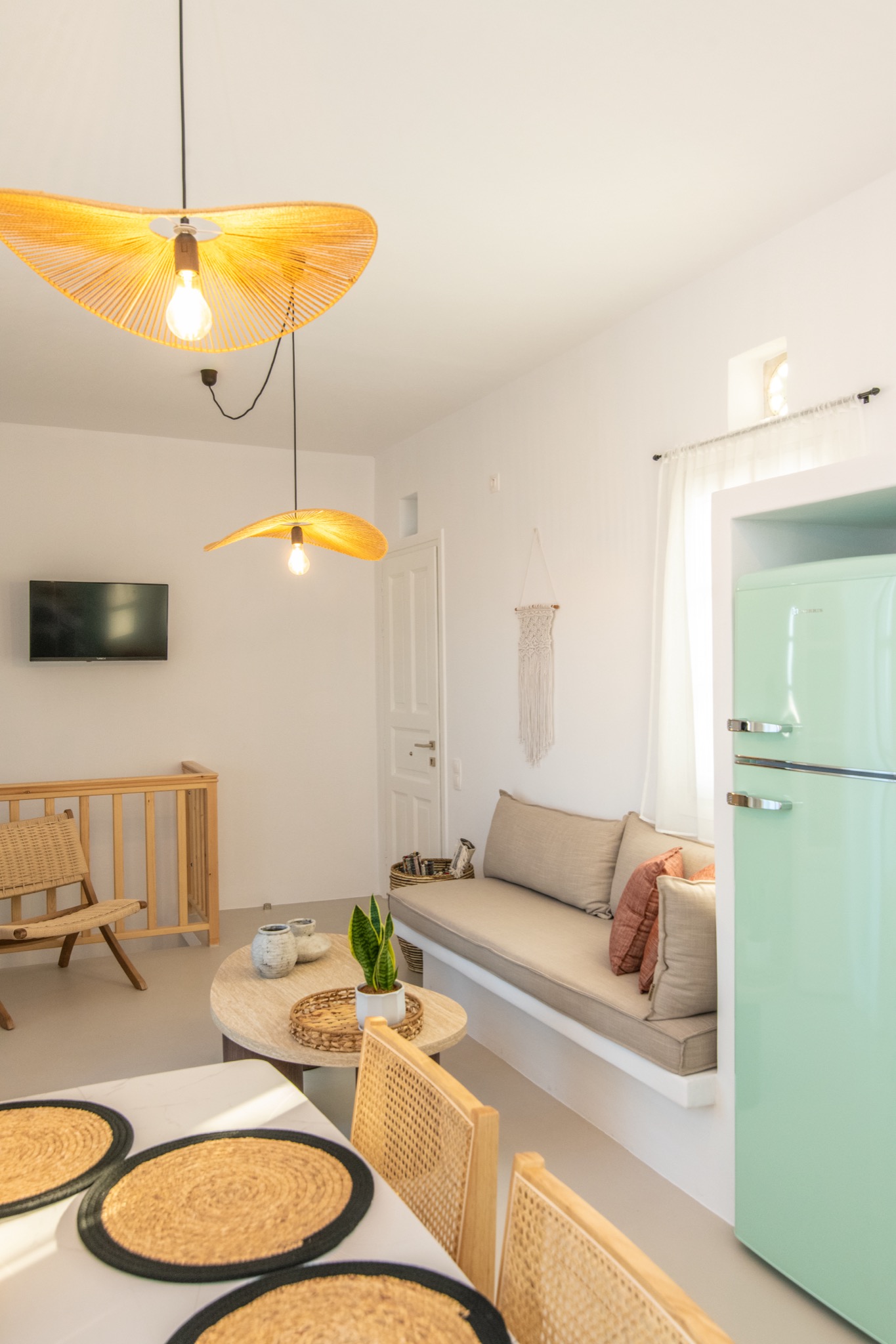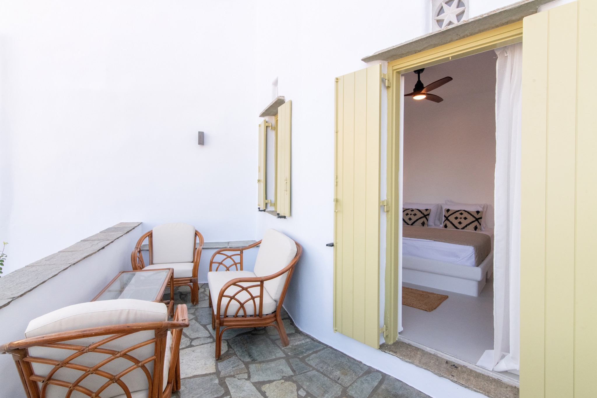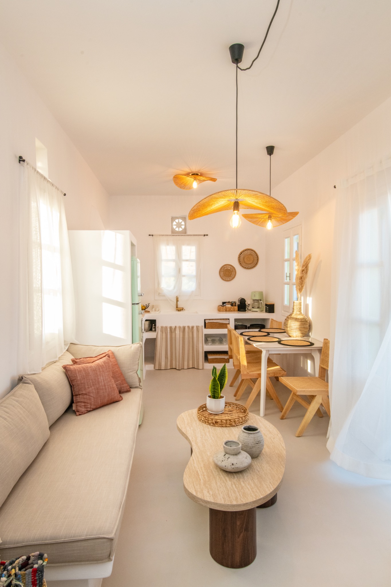 The interior features Cycladic minimalism, natural textures, and earthy tones, offering a cozy and elegant retreat.