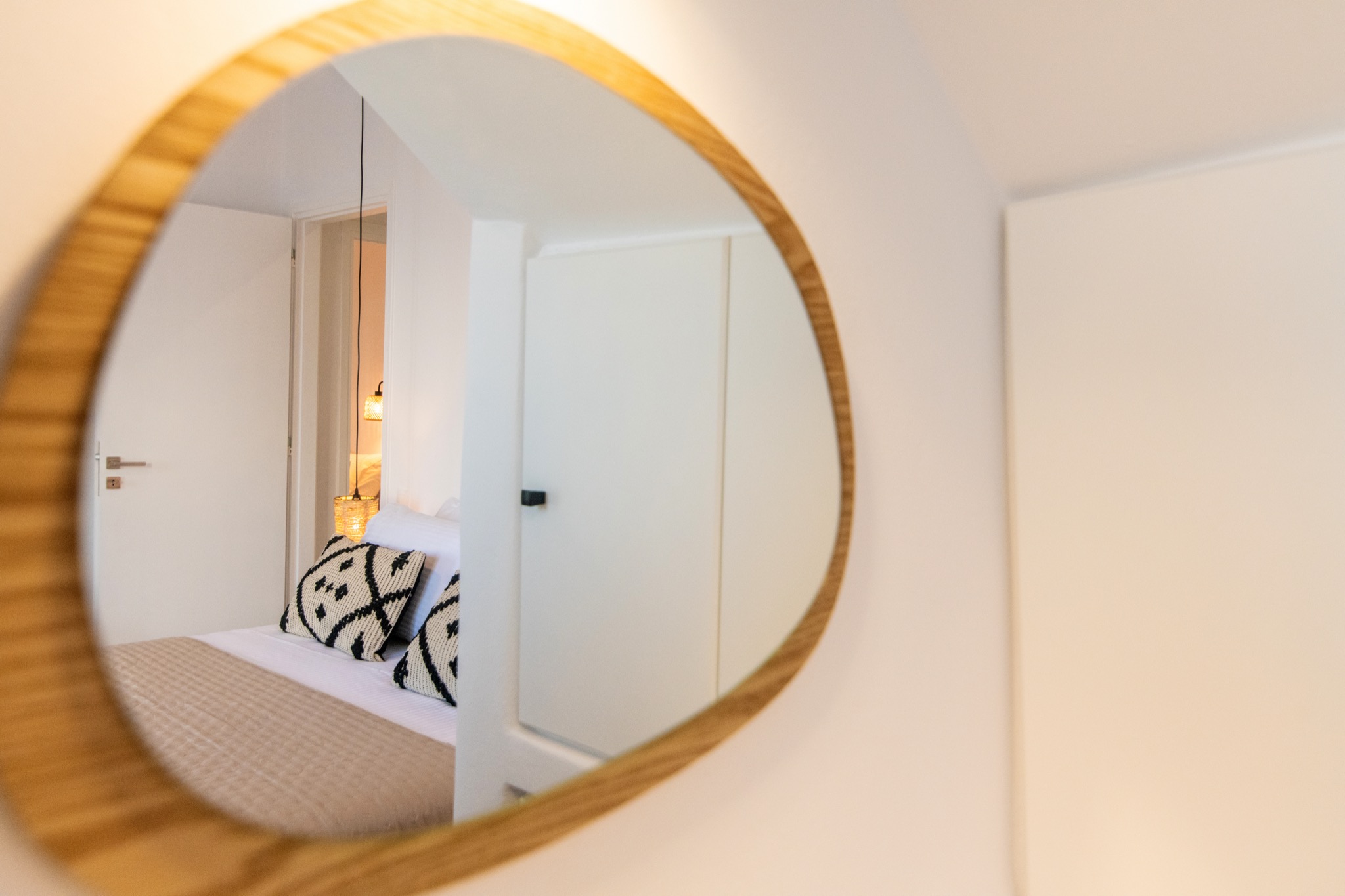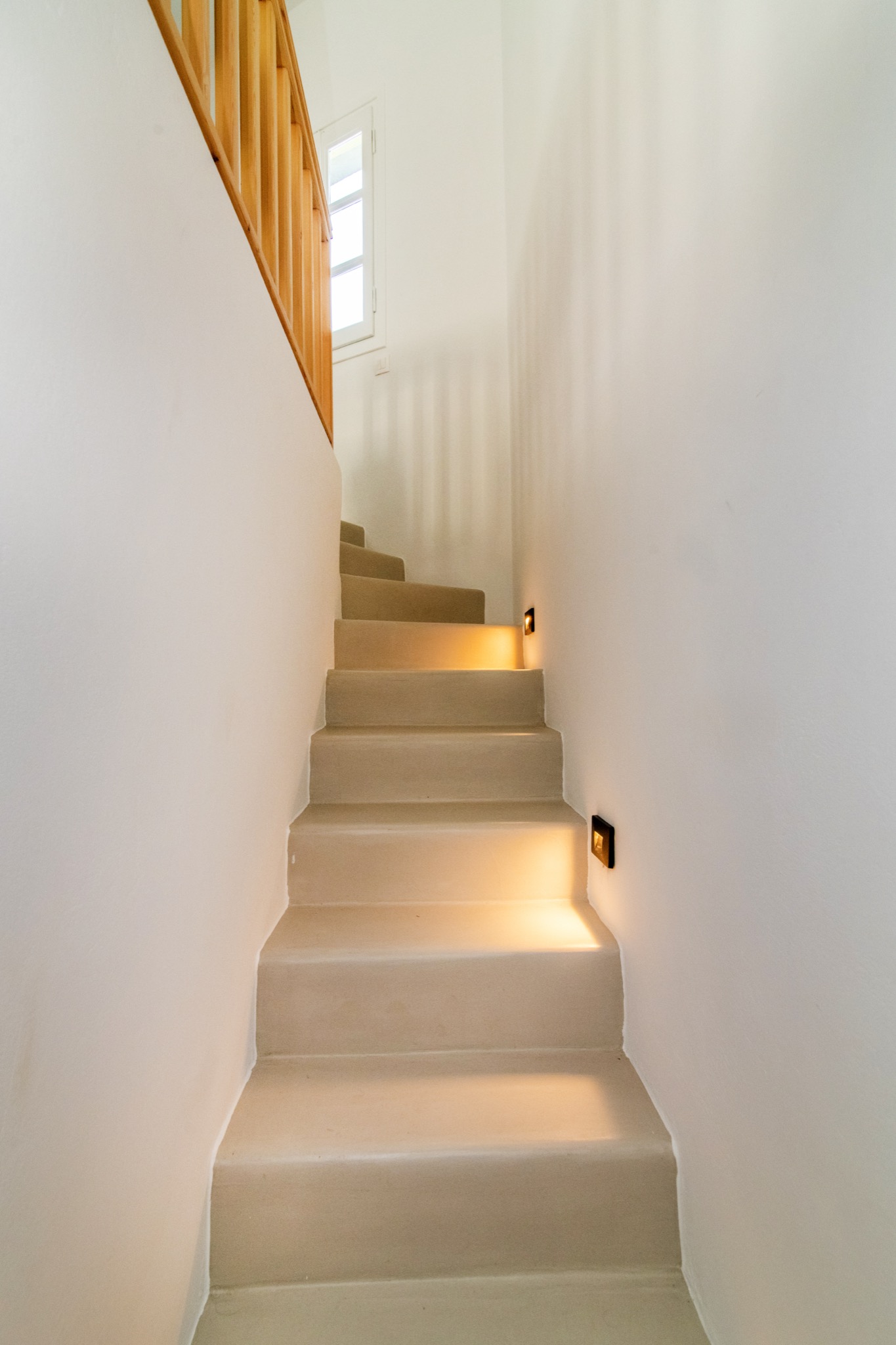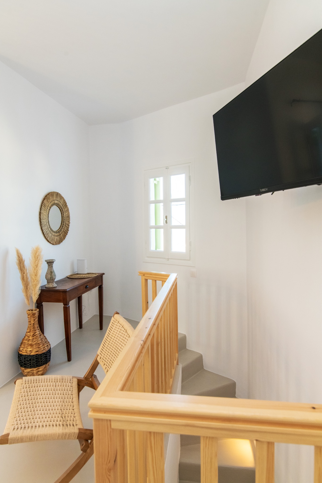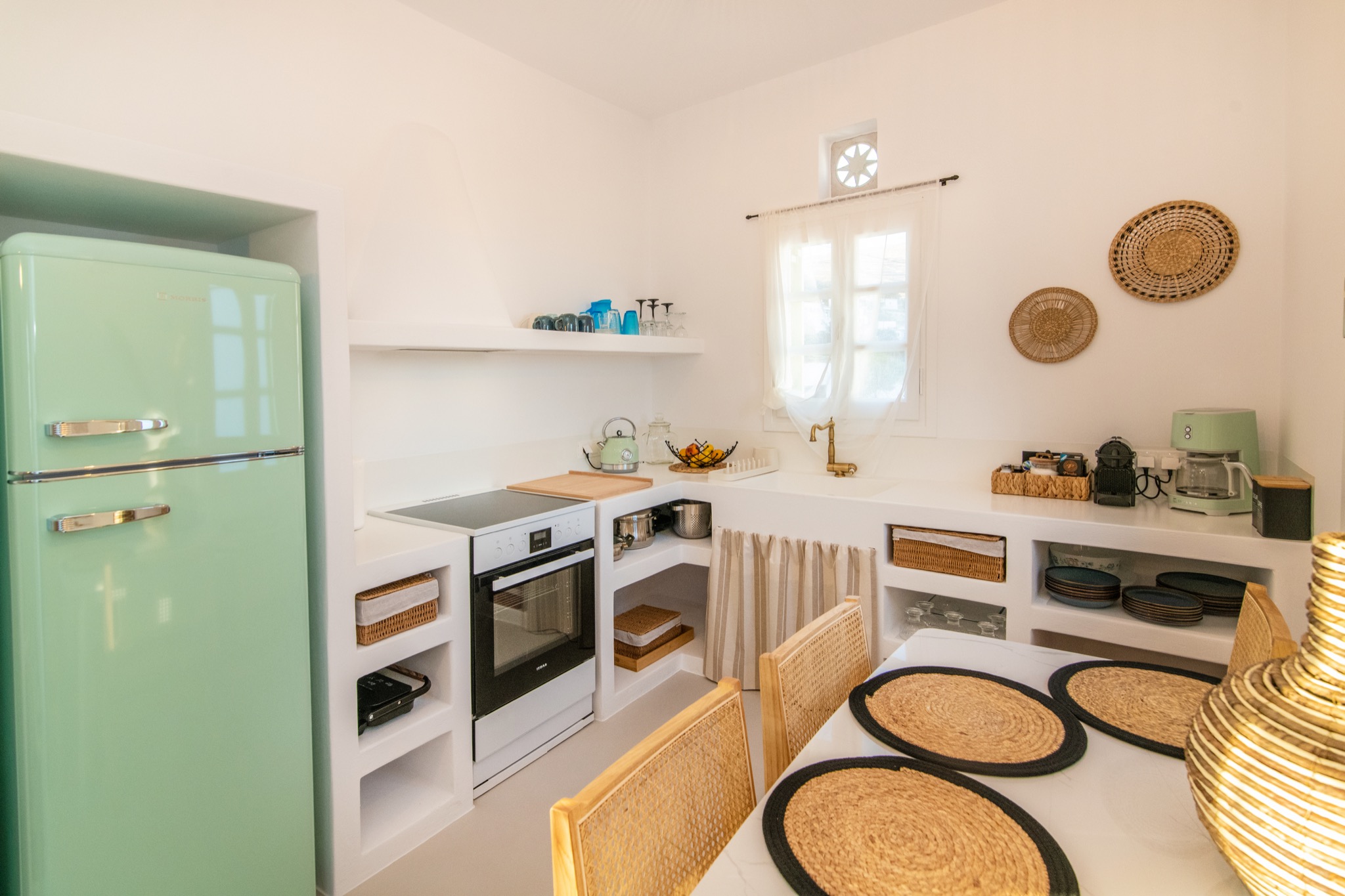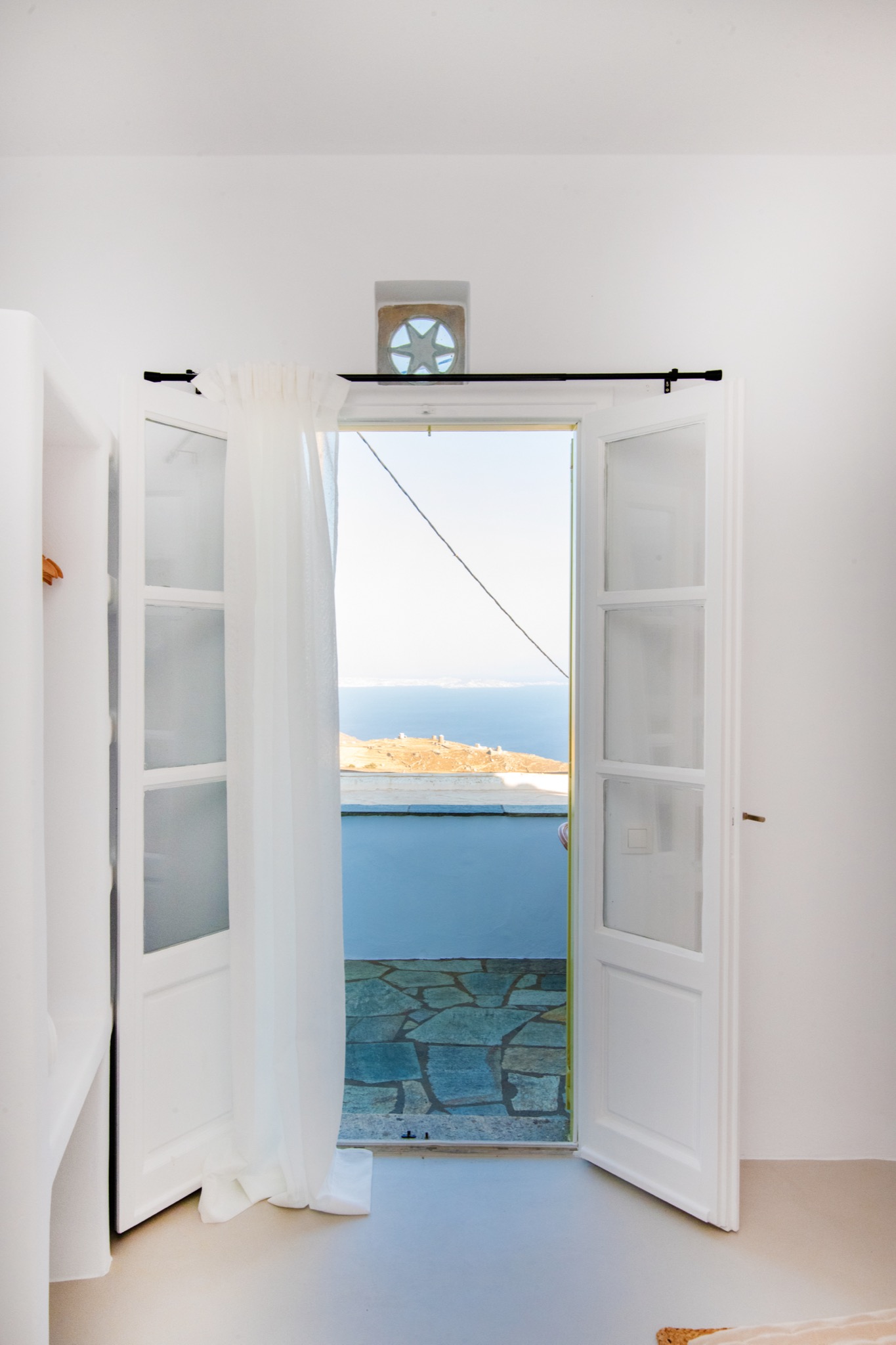 The interior features Cycladic minimalism, natural textures, and earthy tones, offering a cozy and elegant retreat.