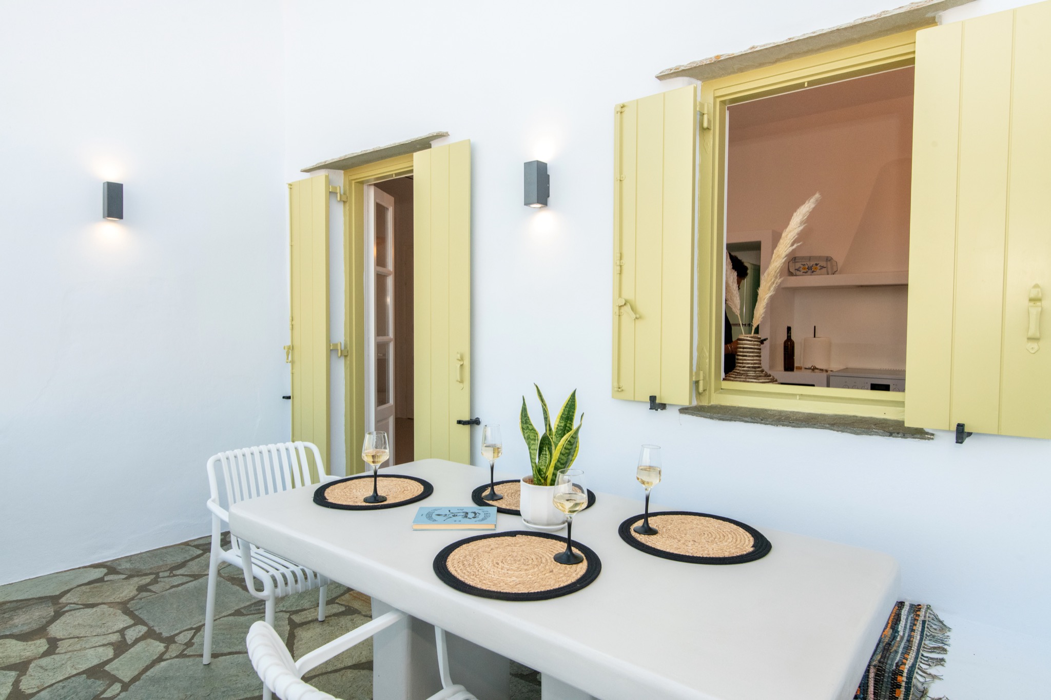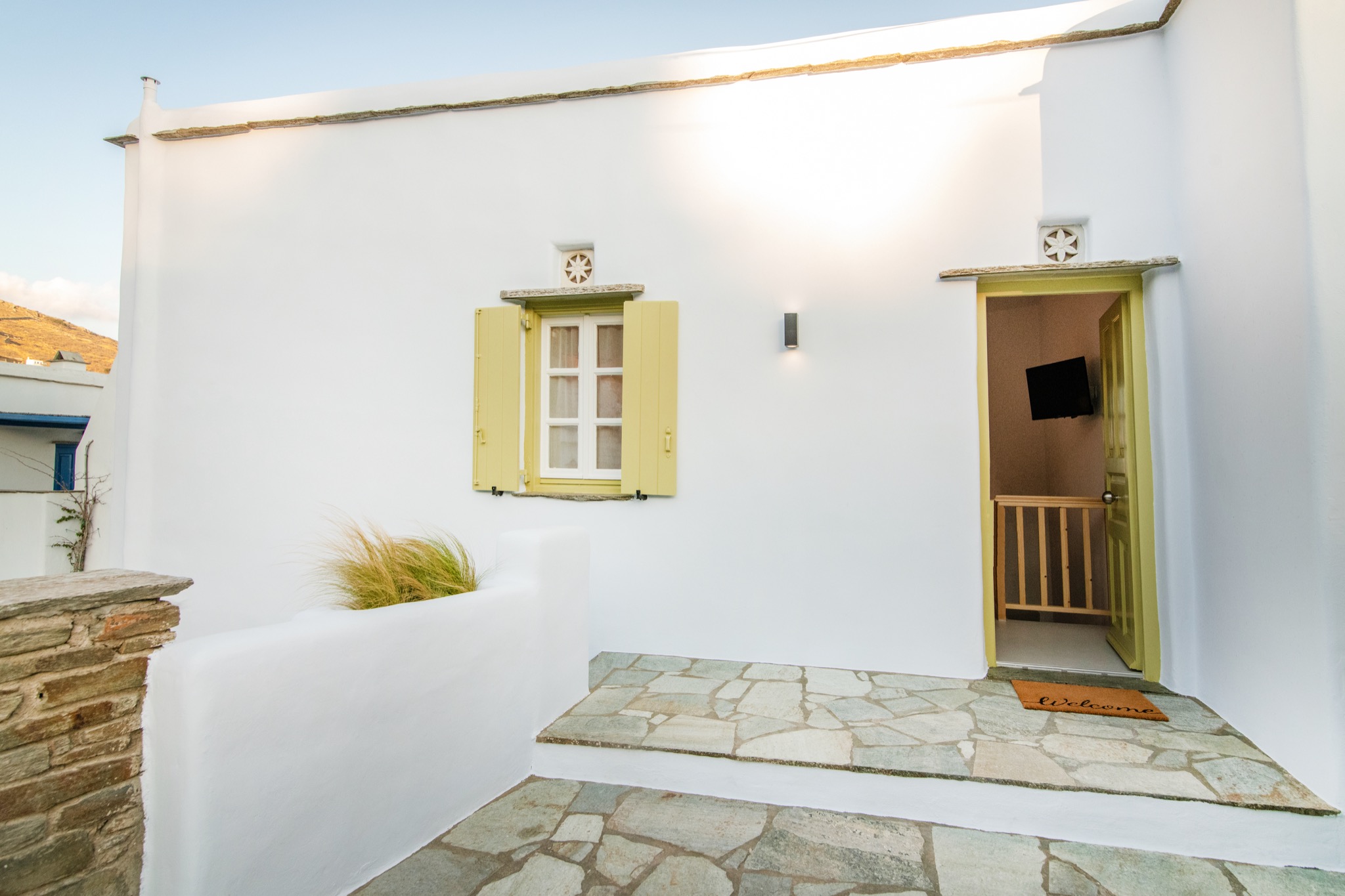 The house is located in the picturesque village of Arnados, offering traditional charm and serenity. A car is recommended for easy transportation to town and beaches. You’ll find tavernas, walking trails, and incredible views within the village.